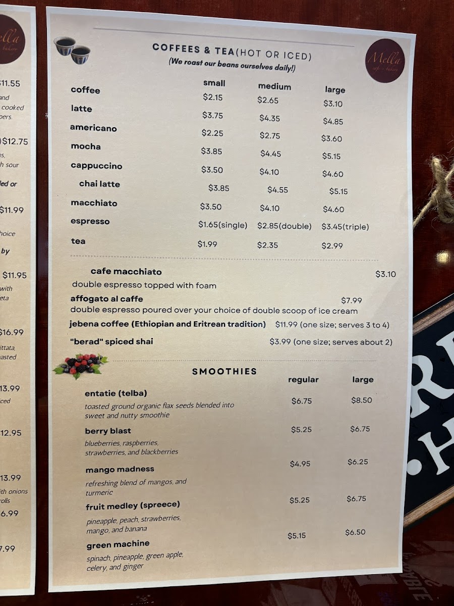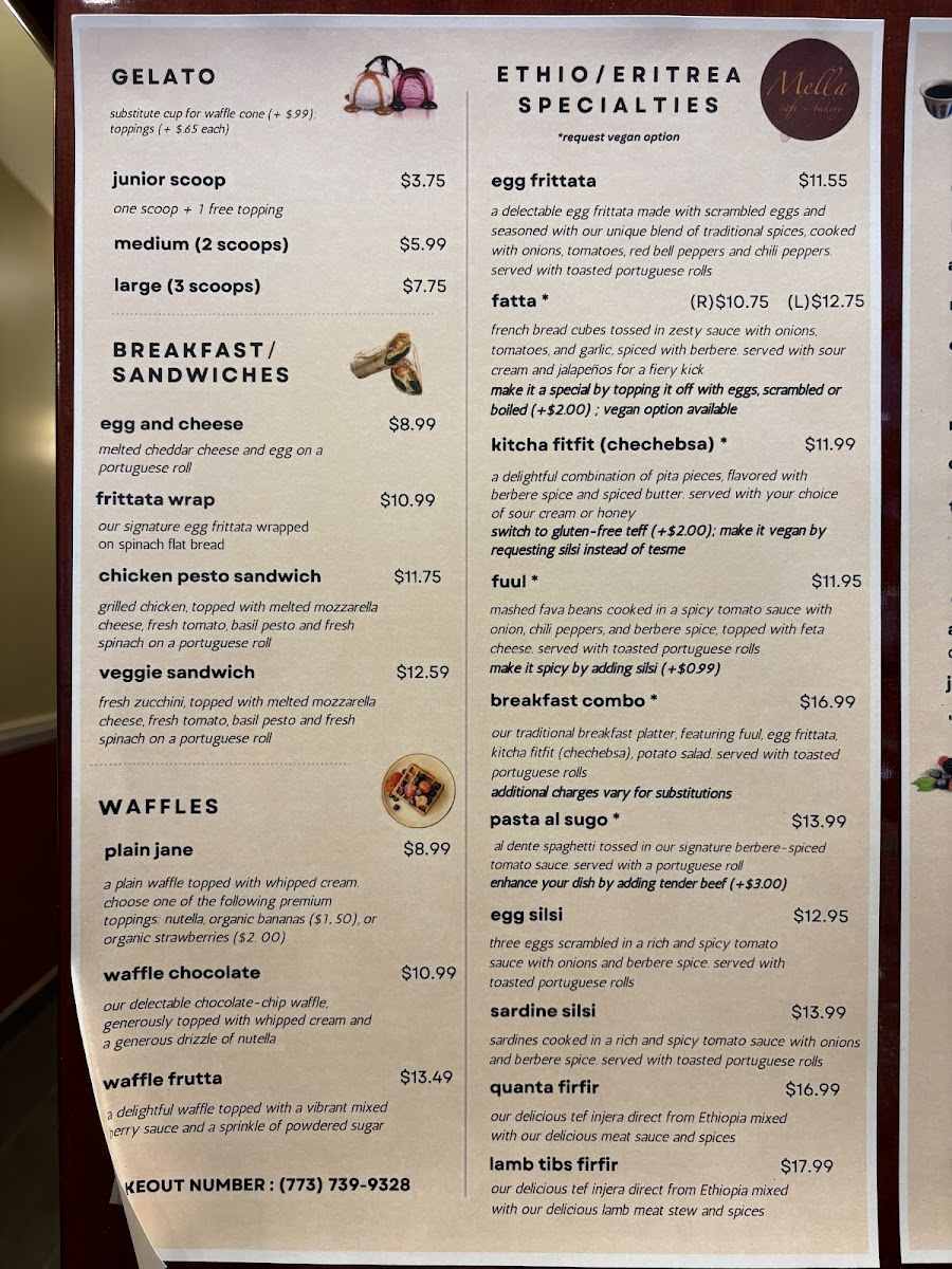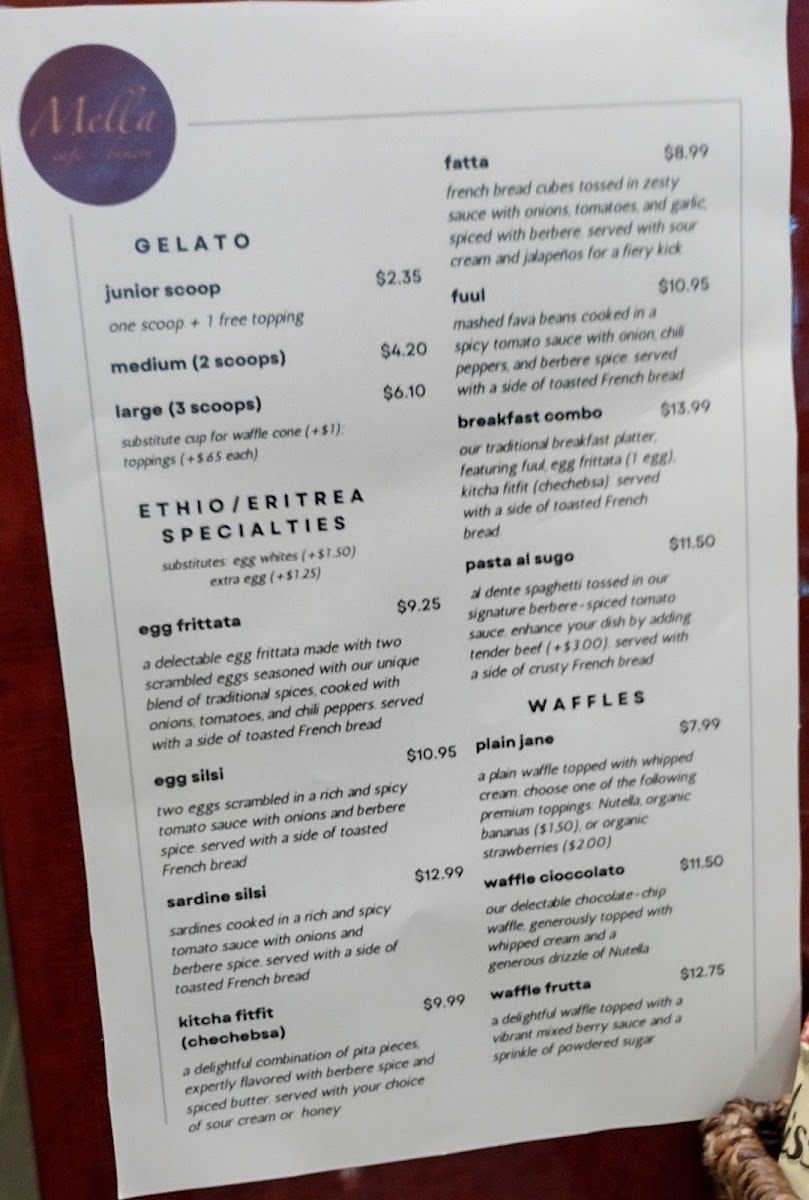 The menu at Mella Café offers a delightful variety of dishes, catering to different tastes and preferences. For breakfast or a light meal, the Waffle Frutta, Plain Jane, and Waffle Cioccolato provide a delicious starting point. Each waffle option offers a unique twist, whether you're craving fresh fruit, a classic plain waffle, or a rich chocolate indulgence. The café also specializes in their in-house roasted coffee and a selection of teas, perfect for pairing with any dish. For those seeking something more savory, the Breakfast Combo, Egg Frittata, and Pasta Al Sugo stand out. Traditional Ethiopian and Eritrean flavors are celebrated with dishes like Fuul and Sardine Silsi, offering a rich and authentic taste of the region. To finish your meal on a sweet note, the café's Gelato is a must-try, with options like Medium (2 Scoops), Large (3 Scoops), and a Junior Scoop for smaller cravings. Overall, Mella Café offers a versatile menu, blending sweet, savory, and comforting options to suit every appetite.